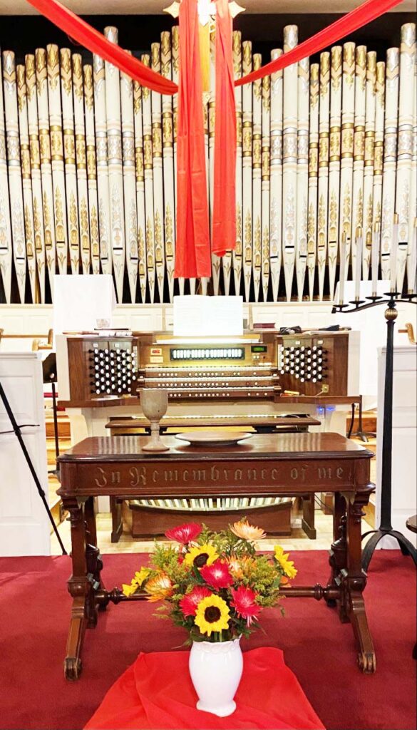 Because of the complicated acoustical properties of this historic sanctuary the gallery division was added to help lead congregational singing. It is really a small organ in and of itself, and is controlled by the bottom keyboard on the console. Here our organist shows one of the pipes on during an “organ tour”.