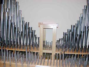This division, located behind the left side of the facade, is enclosed in a chamber with louvered shutters which enable the folume of the organ to be controlled by the organist. Swell divisions are known for their reed pipes, shown here.