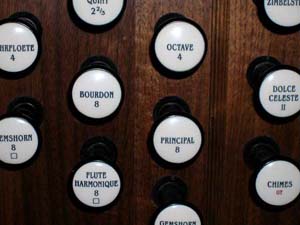The knobs on each side of the keyboards control which row of pipes, called ranks, are to be played. Each rank of pipes (usually 61 pipes) has a specific sound and pitch. The type of sound is indicated by the name, and the pitch is indicated by the number on each drawknob. The number 8 indicates that the rank of pipes will sound at the standard pitch, like a piano. The number 4 indicates the pitch will actually be an octave higher.